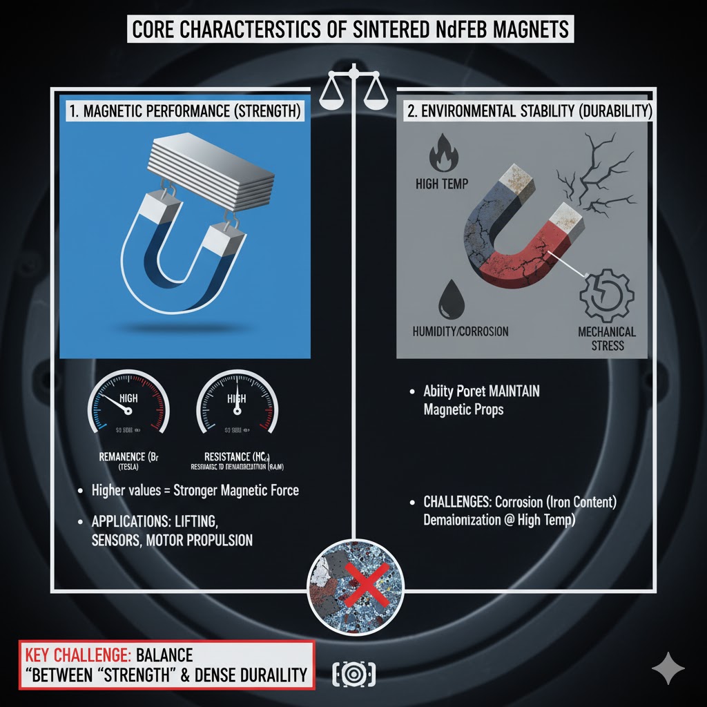 Sintrade NdFeB-magneter (neodym-järn-bor) är bland de starkaste permanentmagneterna som finns tillgängliga och används ofta i industrier som elektronik, fordon och förnybar energi. Deras "kärnegenskaper" kretsar kring två motstridiga men ändå kritiska egenskaper: magnetisk prestanda och miljöstabilitet. Magnetisk prestanda definieras av mått som remanens (Br, den maximala magnetiska flödestätheten) och koercivitet (HcJ, motståndet mot avmagnetisering) – högre värden betyder starkare magnetisk kraft för uppgifter som lyft, sensoraktivering eller motordrivning. Stabilitet, däremot, hänvisar till magnetens förmåga att behålla dessa egenskaper under svåra förhållanden: höga/låga temperaturer, fuktighet, korrosion eller mekanisk påfrestning. Traditionella sintrade NdFeB-magneter är naturligt benägna att korrosion (på grund av deras järninnehåll) och kan förlora magnetism vid förhöjda temperaturer, vilket gör balansen mellan "styrka" och "hållbarhet" till en viktig utmaning för både tillverkare och användare.